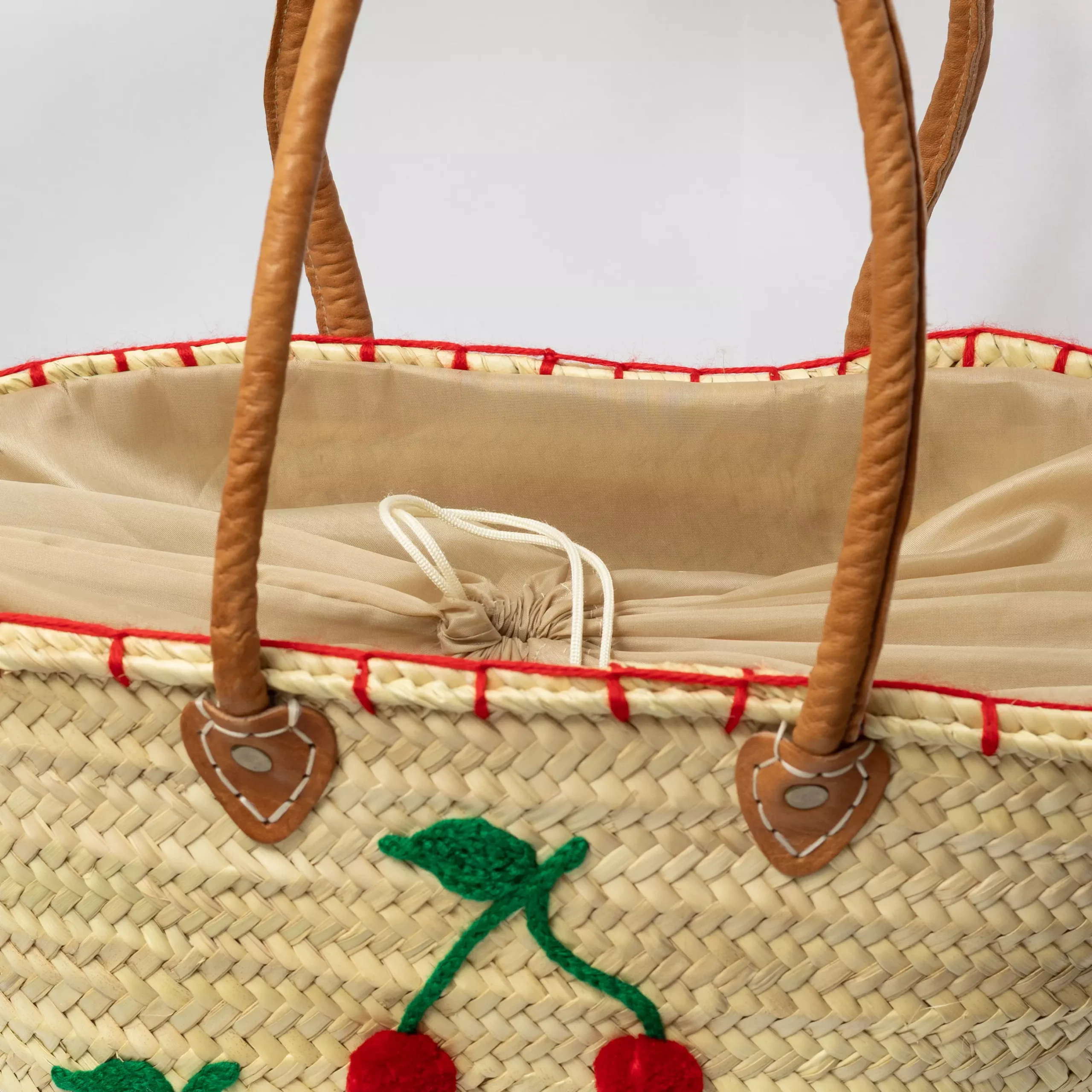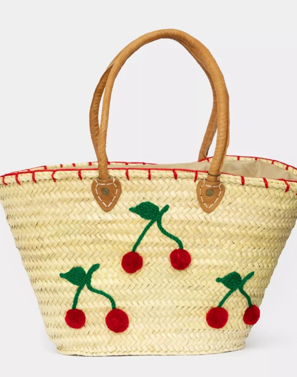 Bolsa de palha com alças de couro e detalhe em cerejinhas bordadas — charmosa, leve e perfeita para dias ensolarados!